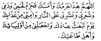 Allahumma haza haramuka wa amnuka faharrim lahmi wa dami wa sha'ri, wa bashari 'alan naari, wa Aaminni min aazabika yauma tab'azthu ibaadika waj halni min auliyaa ika wa ahli ta atika